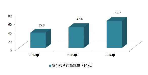 據《中國物聯網芯片行業市場前瞻與投資分析報告》數據,2014-2016年間,我國信息安全芯片市場規模增長迅速,2016年我國信息安全芯片市場規模達到62.2億元,同比增長30.7%。