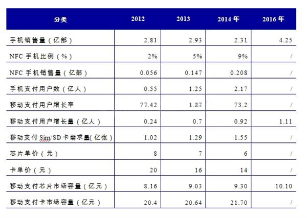 由于普通電信卡的壽命一般為3-4年,所以未來移動支付芯片的市場需求將主要來自于新增手機用戶的需求和廢舊卡的更新換代。2014年,中國NFC手機銷量約為0.208億部,移動支付芯片市場需求規模在9.30億元。2016年,中國移動支付芯片市場需求規模在10.10億元左右。